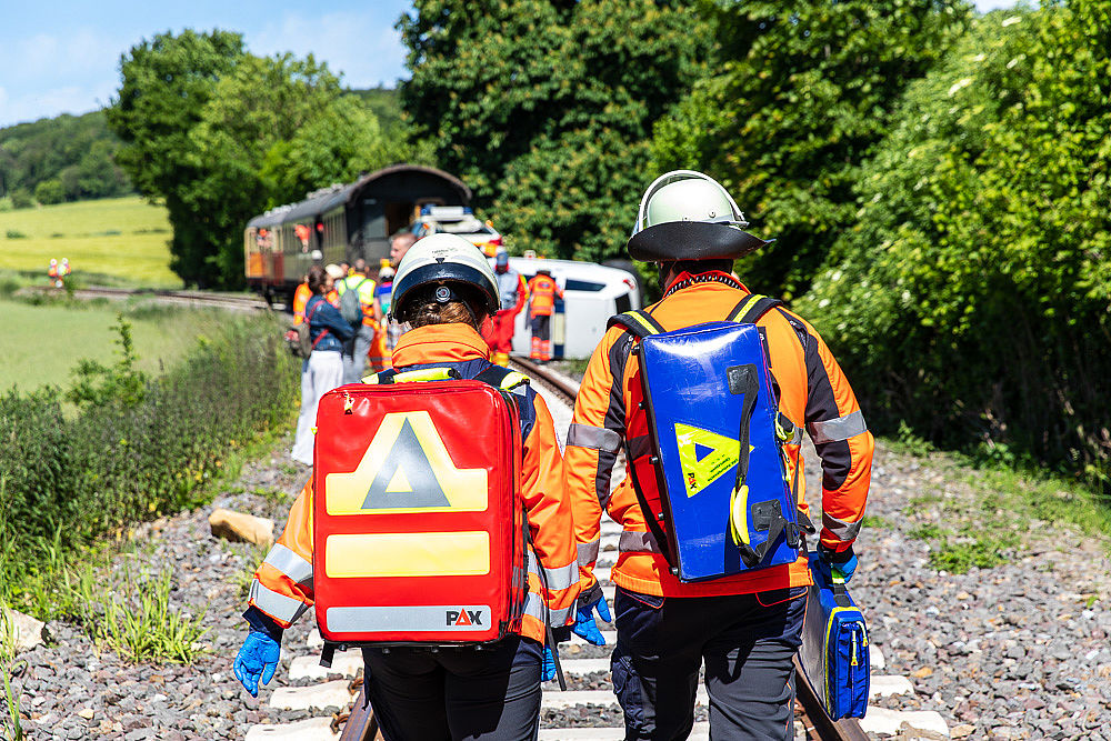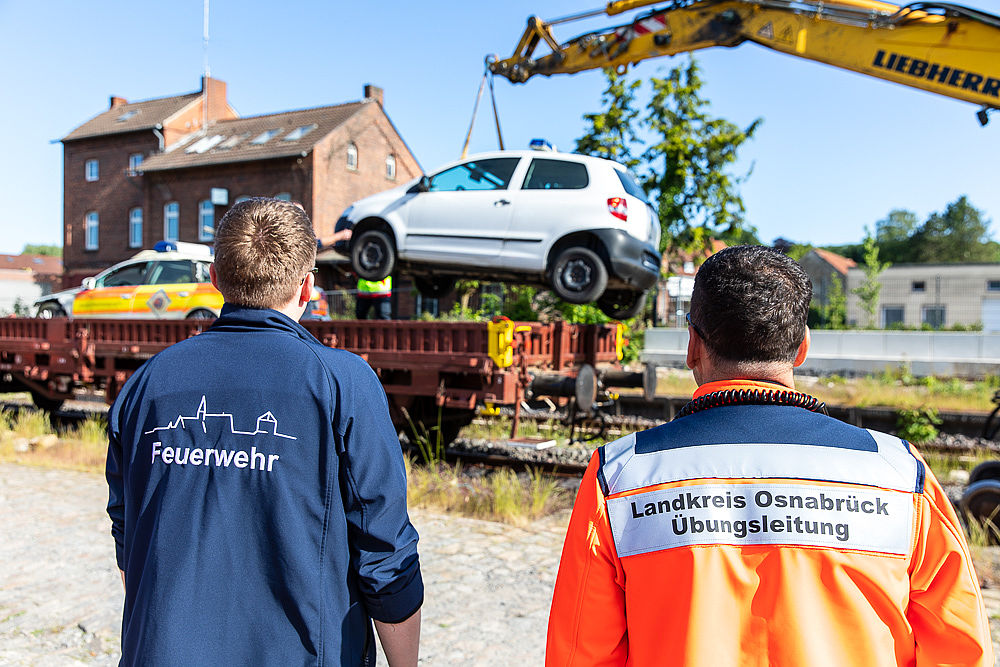 Viel Martinhorn war am 03. Juni in Bad Iburg zu hören. Rund 150 Einsatzkräfte von Feuerwehr, THW, DRK & den Maltesern übten an den Bahngleisen im Stadtteil Ostenfelde. Angenommenes Szenario war ein Zugunglück, welches zu einem Massenanfall von Verletzten (MANV) geführt hatte. Teil des anspruchsvollen Szenarios war unter anderem, dass zwei PKW von einer Bahn erfasst wurden. In diesen Autos befanden sich insgesamt vier Personen, die aufwendig befreit werden mussten. Eines der Fahrzeuge war das ausgemusterte Einsatzfahrzeug des DRK Bad Iburg.